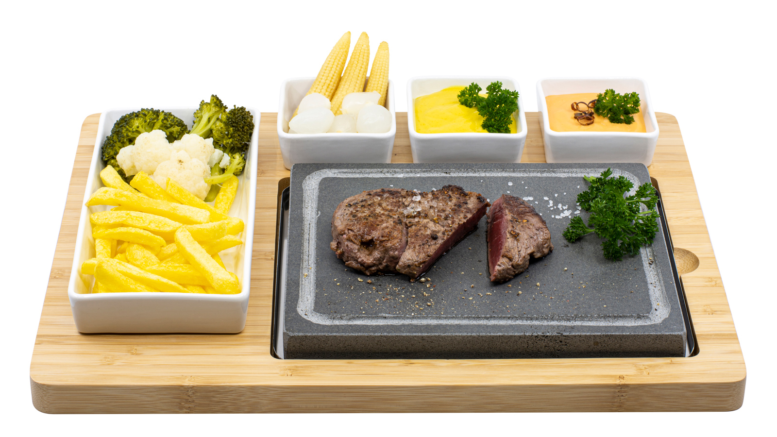 1x Lavastein, 1x Hitzeschutzblech aus Stahl, 1 Bambusplatte,