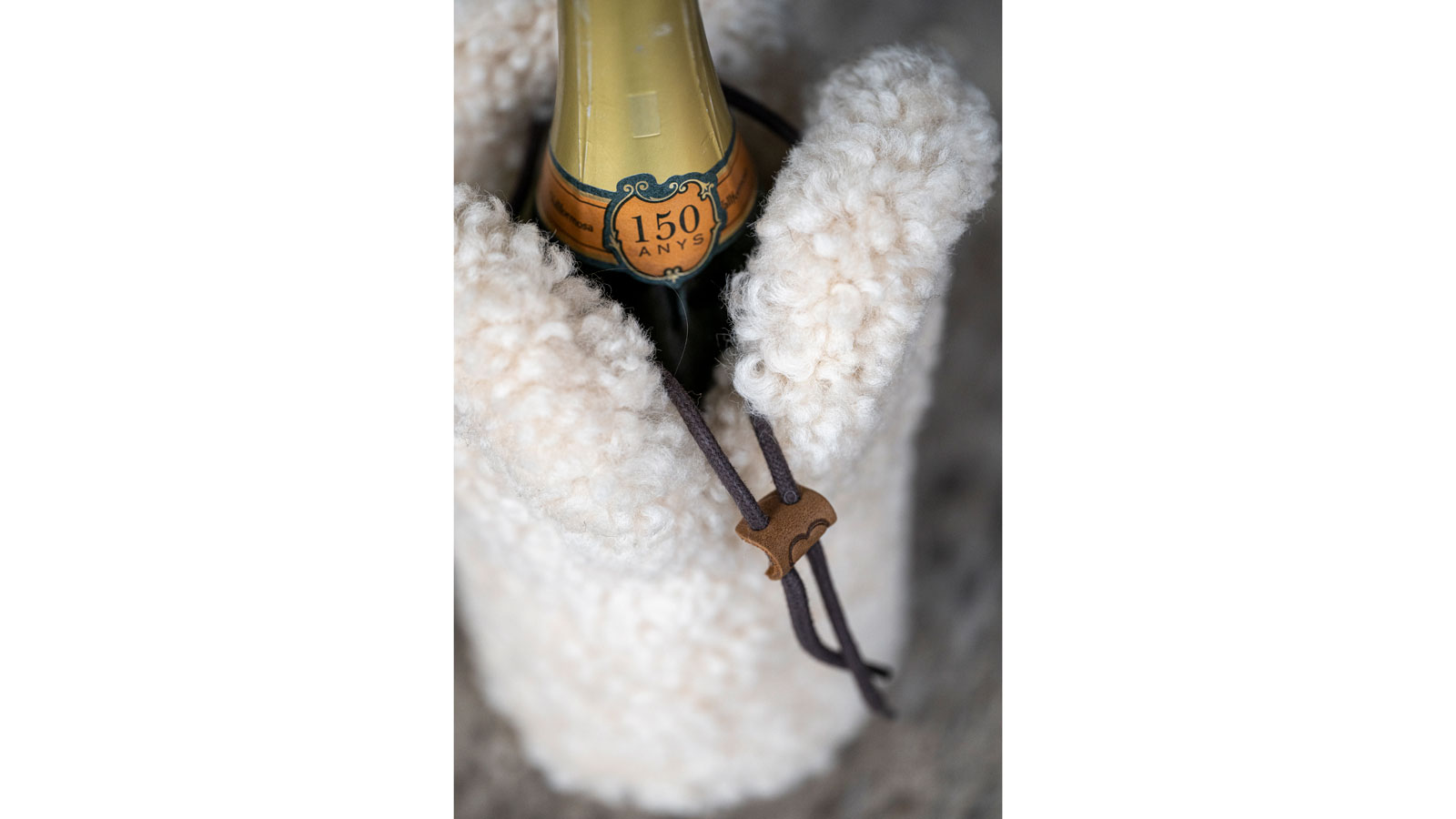 Der Champagnerkühler von KYWIE ist eine Tragtasche aus Schaffell.