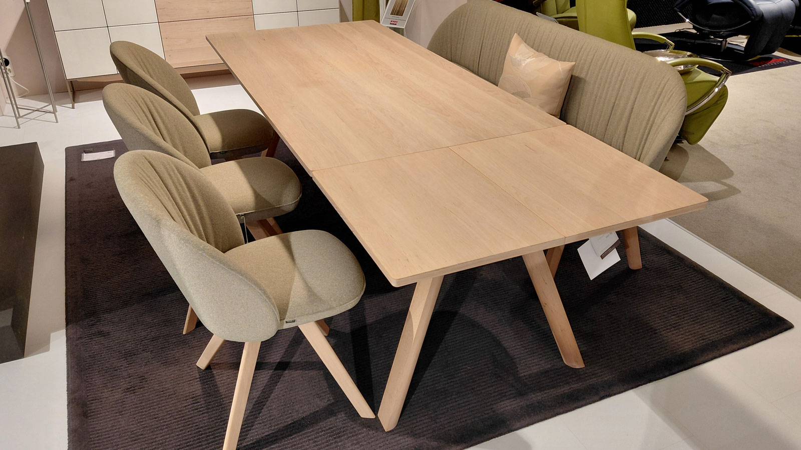 Schlüsselwörter: massivholztisch, holztisch, tischgruppe, drehstuhl, stoffbank, auszugstisch