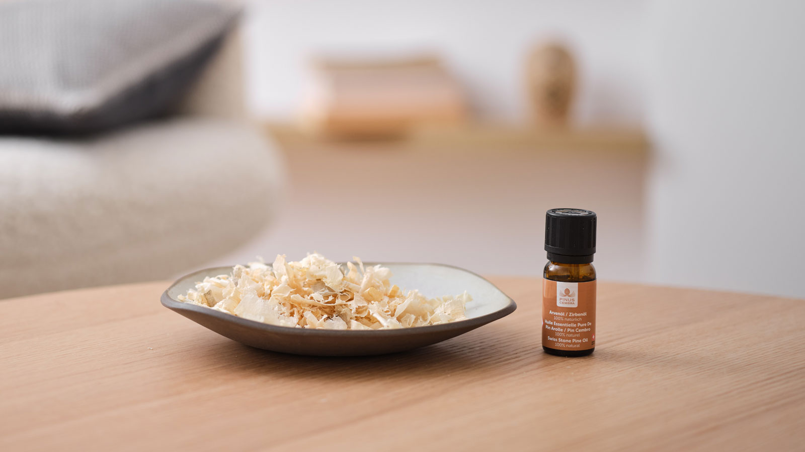 Geben Sie 3 - 5 Tropfen von unserem ätherischen Bio-Arvenöl auf die Späne im Kissen.