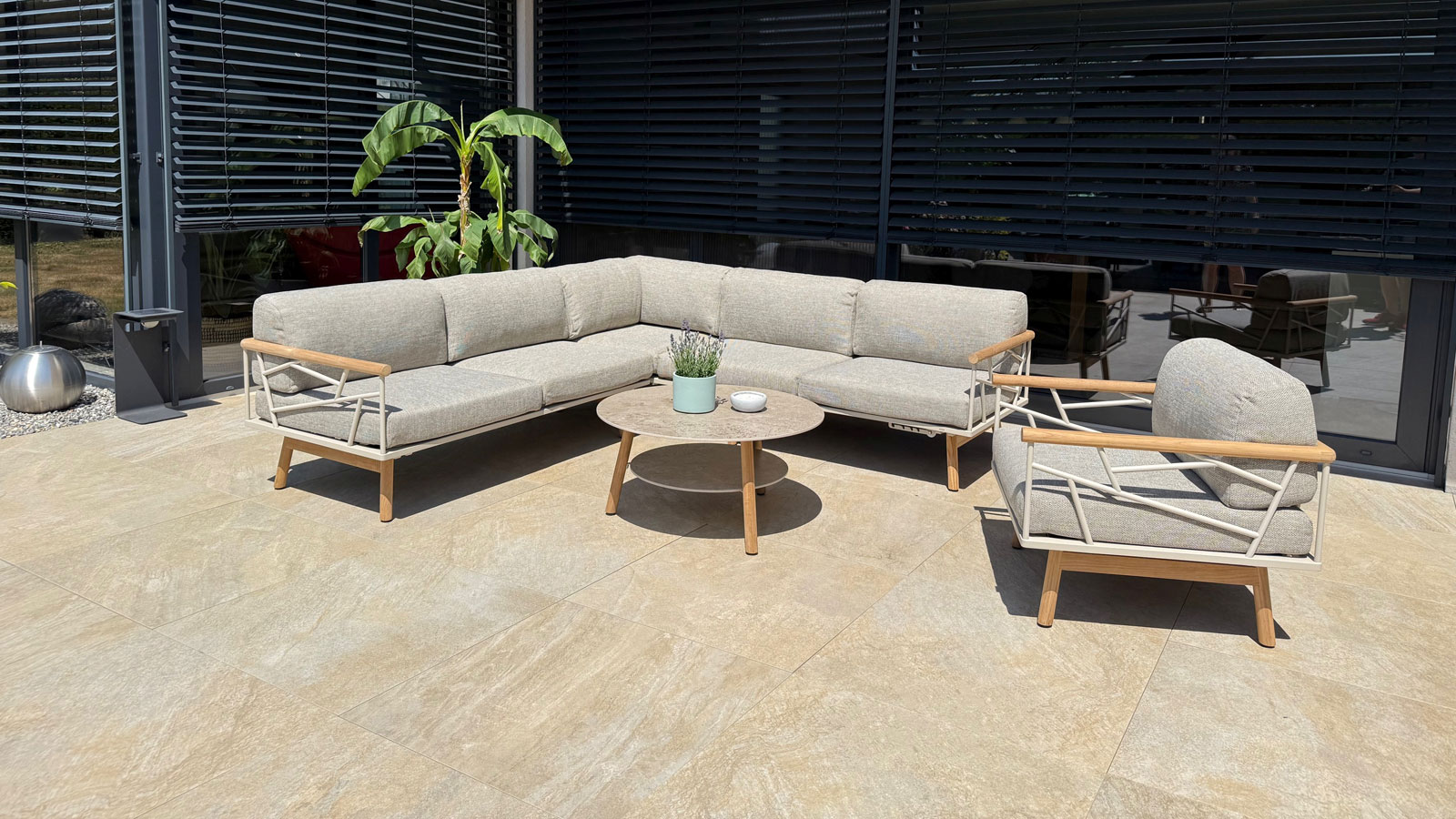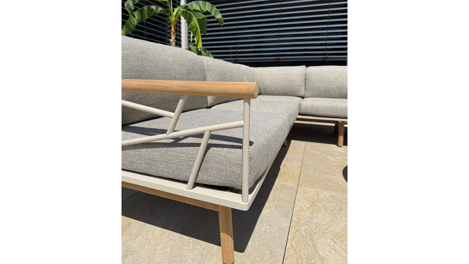 - Beine und Armlehnen: Teakholz