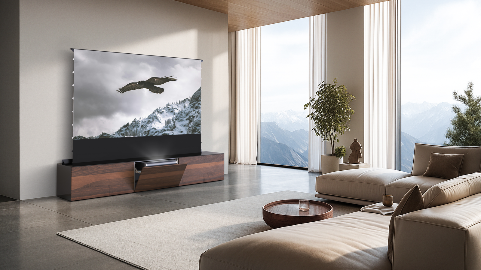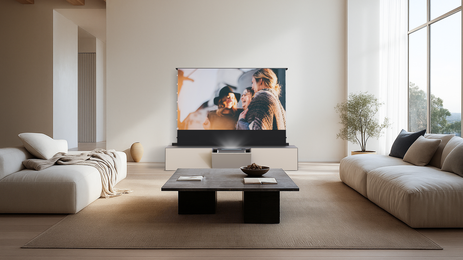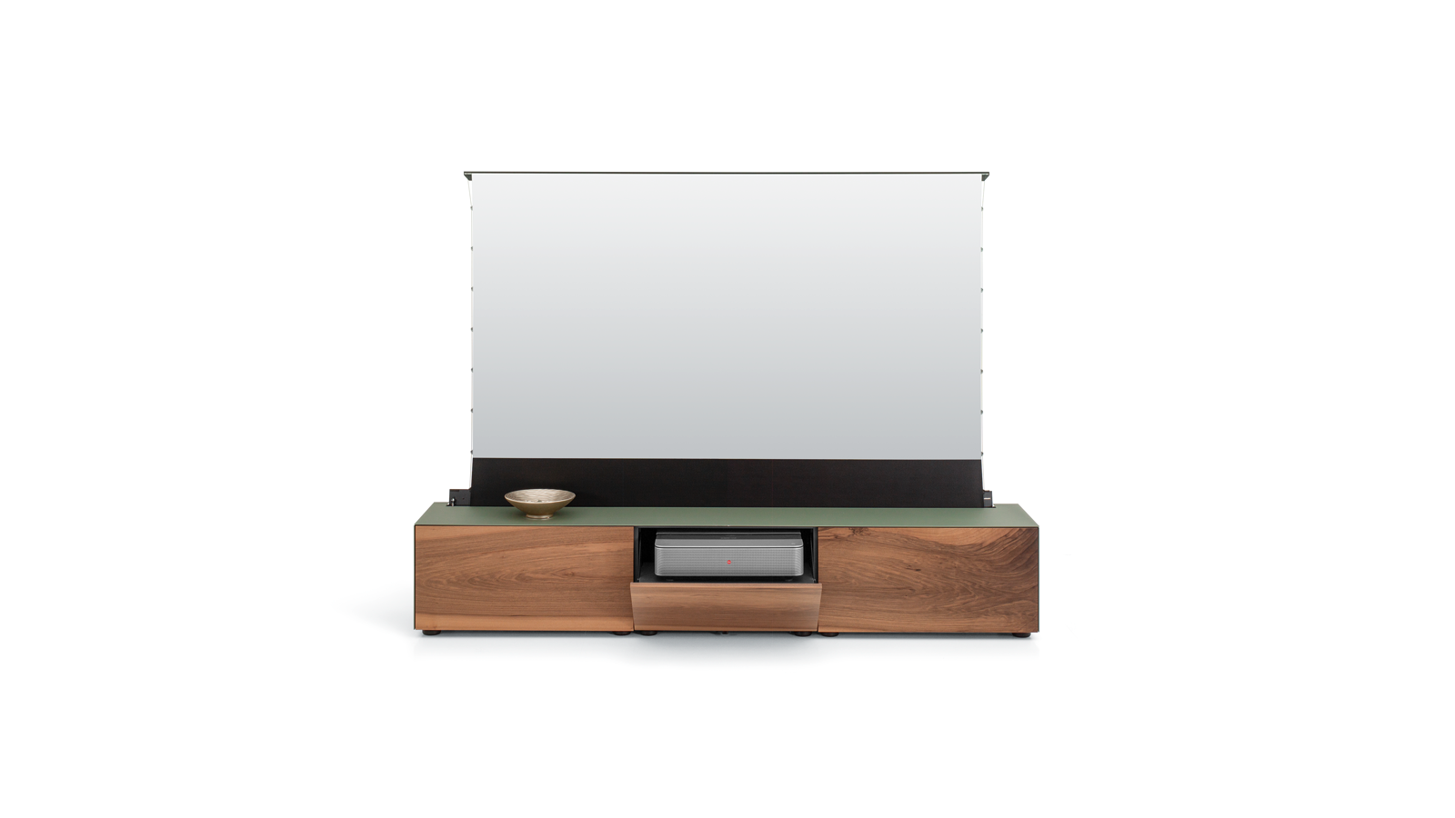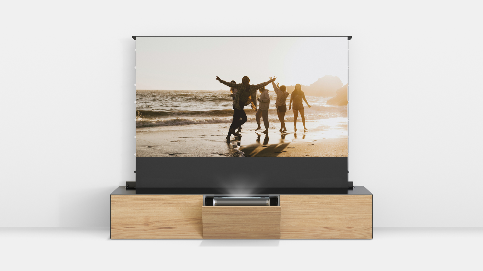 Zeitgleich öffnet sich eine Klappe auf der oberen Rückseite des Lowboards – eine 92-120 Zoll-Leinwand fährt empor. Ist der Mechanismus abgeschlossen, projiziert der Beamer das Bild gestochen scharf direkt auf die Leinwand – für ein beeindruckendes Kinoerlebnis im eigenen Wohnzimmer.